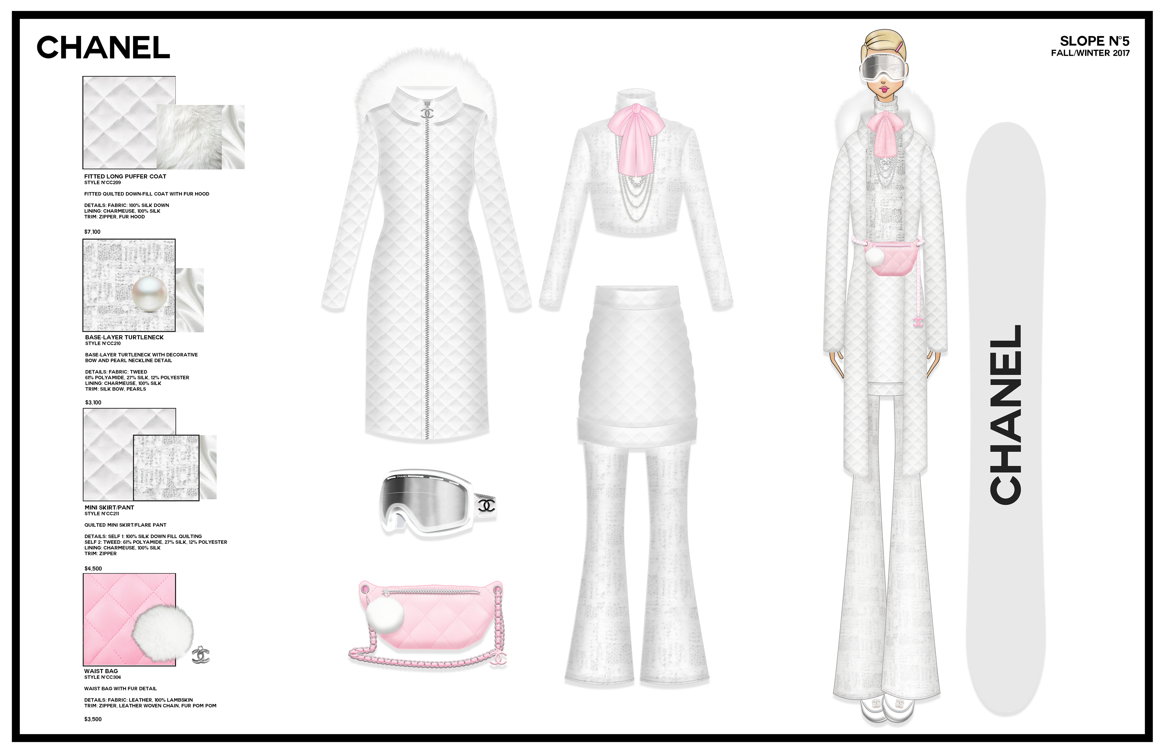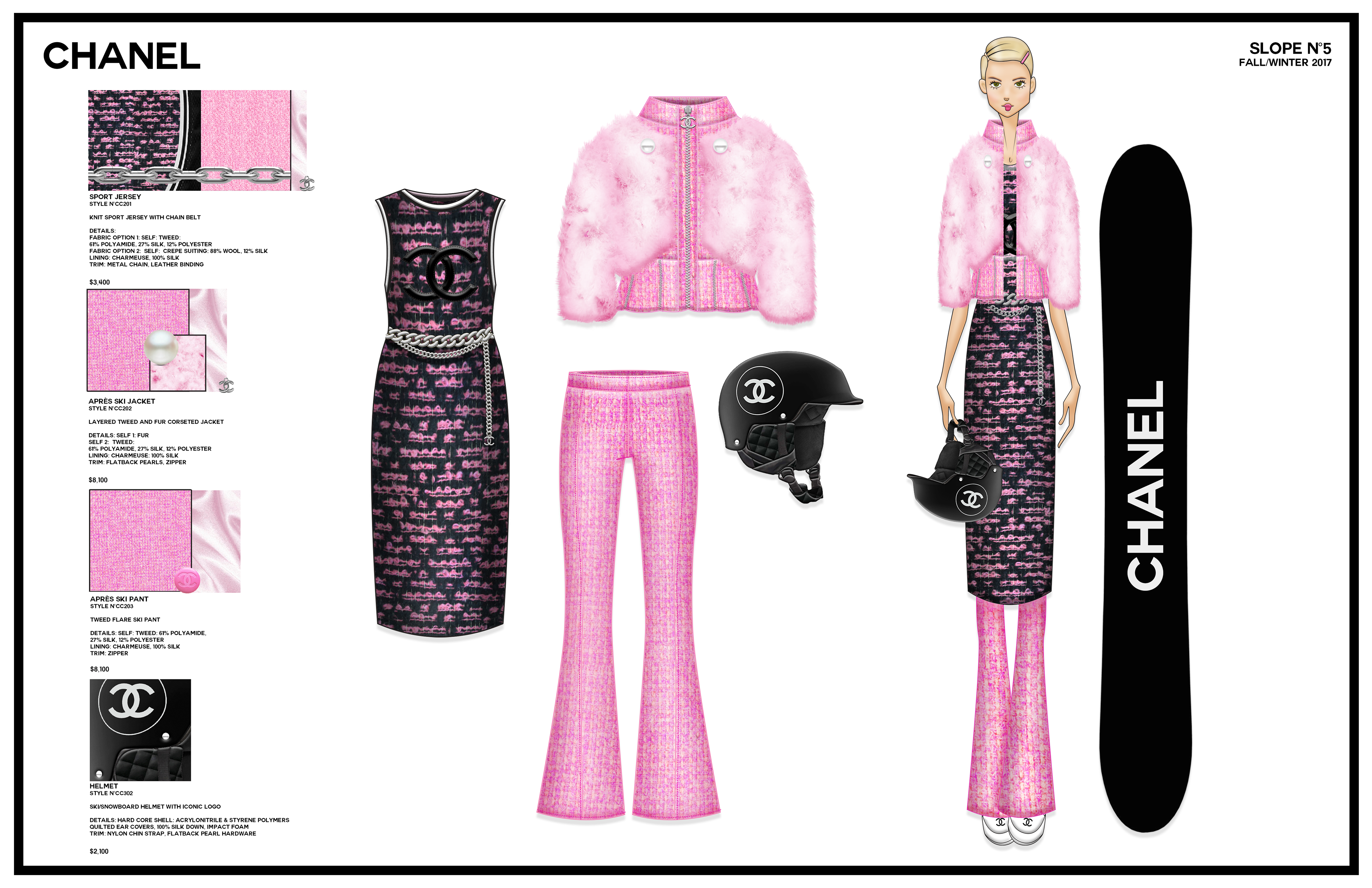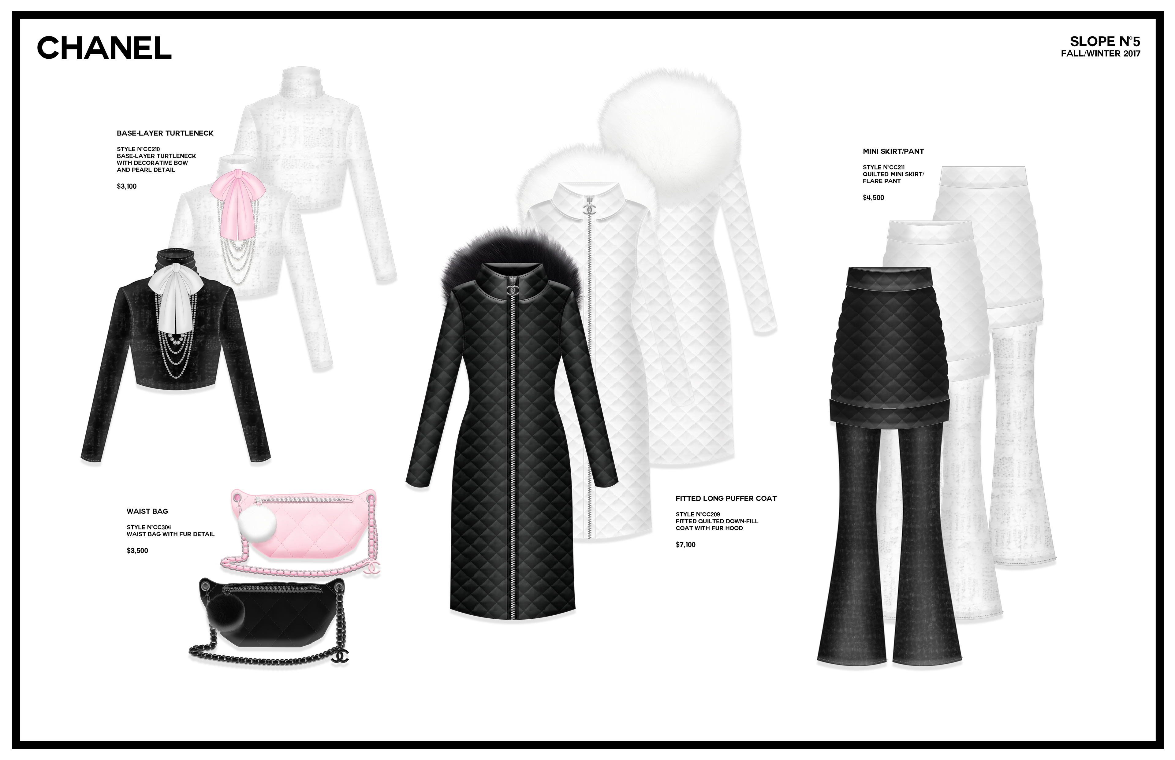 CHANEL Fall/Winter 2017 Ready-to-Wear collection inspired by the theme "Slope No. 5", incorporating authentic CHANEL fabric swatches, buttons, and trims. The collection was meticulously designed with a comprehensive inspiration board, color story, pricing strategy, and original designs, organized into cohesive merchandised looks that reflect the brand’s timeless elegance and modern sensibility. This collection was recognized by the Product Development Board and President of Los Angeles' Fashion Institute of Design & Merchandising (FIDM) and showcased for its innovative approach and design excellence.