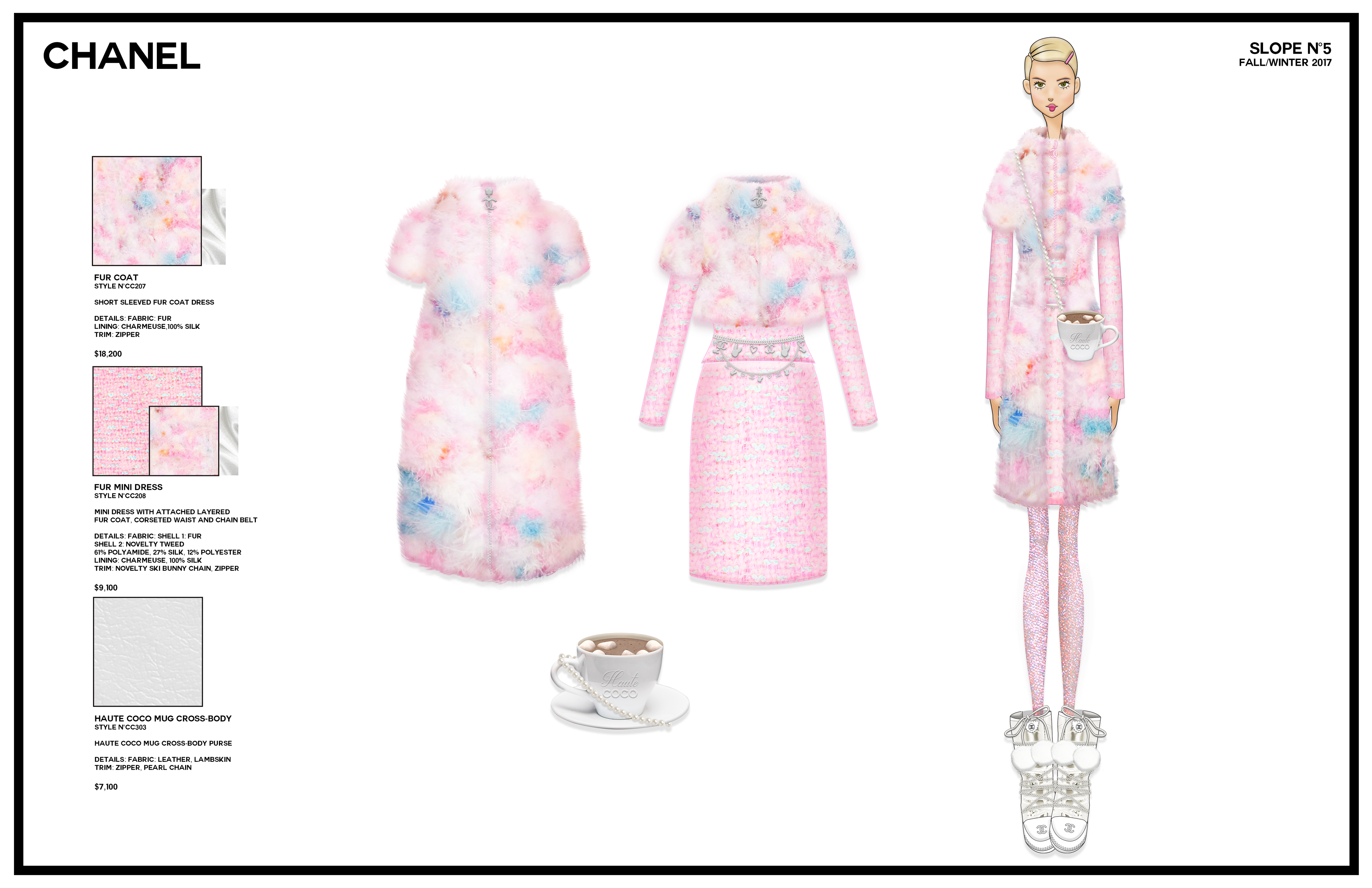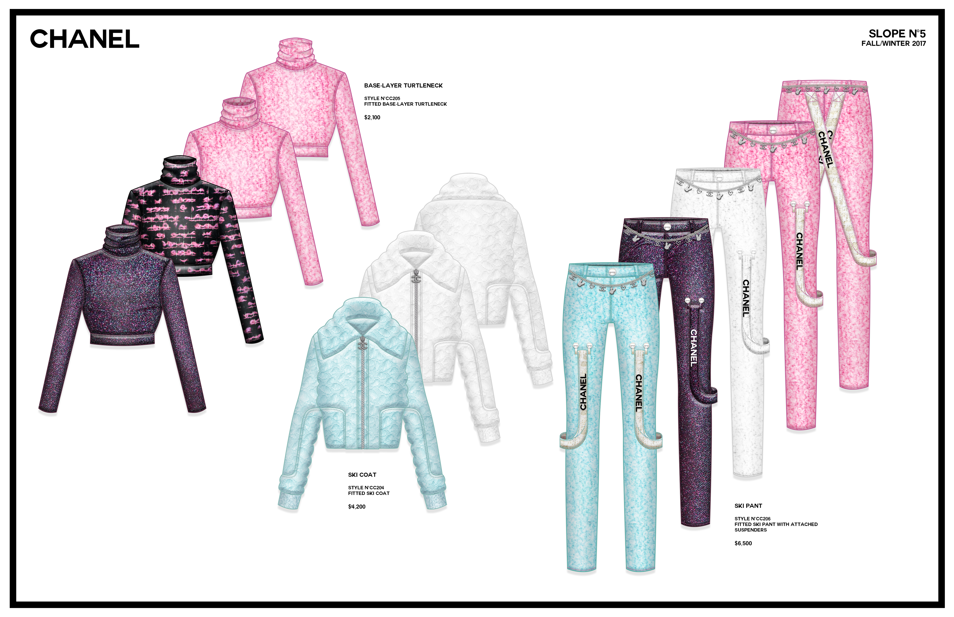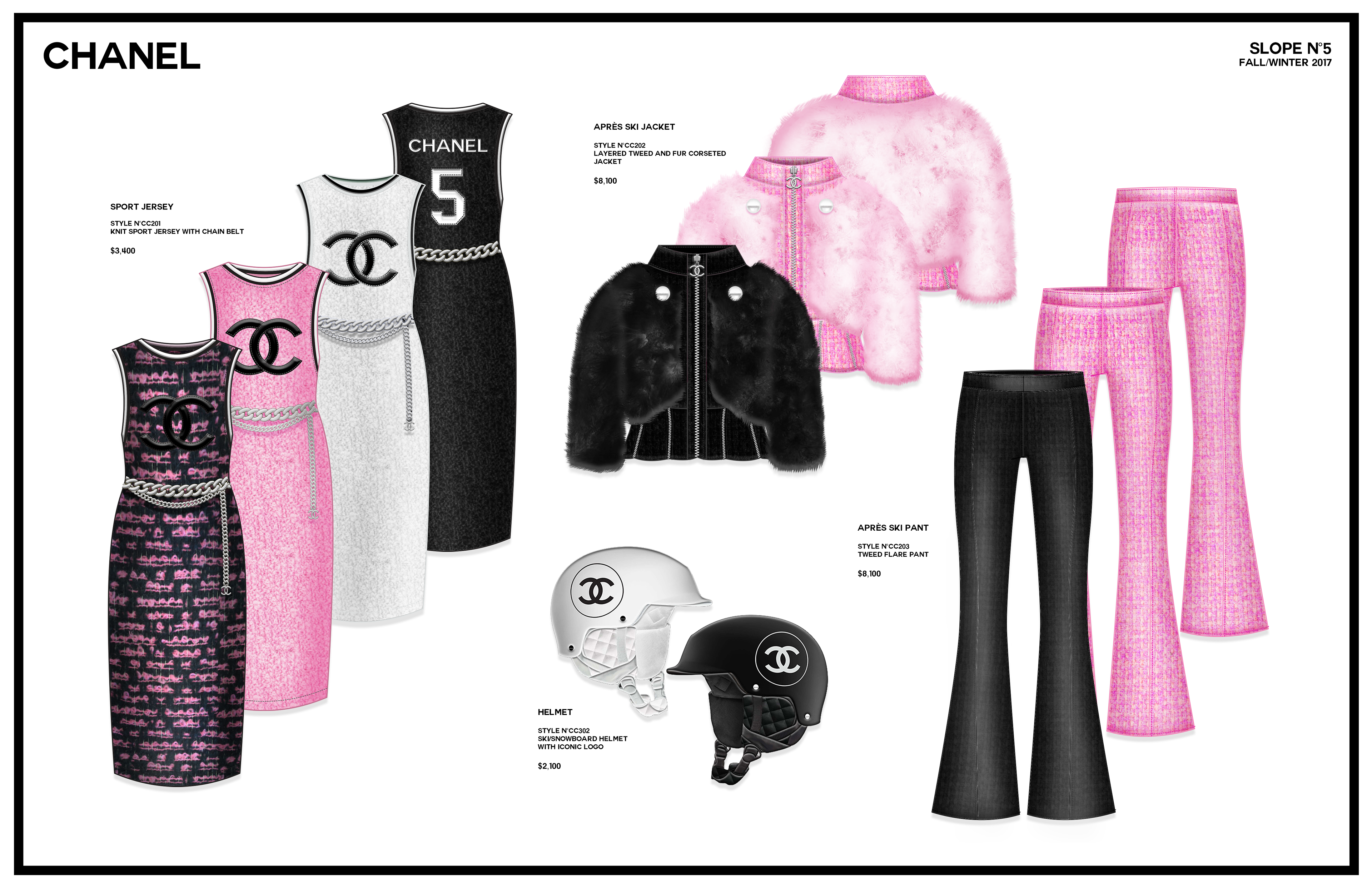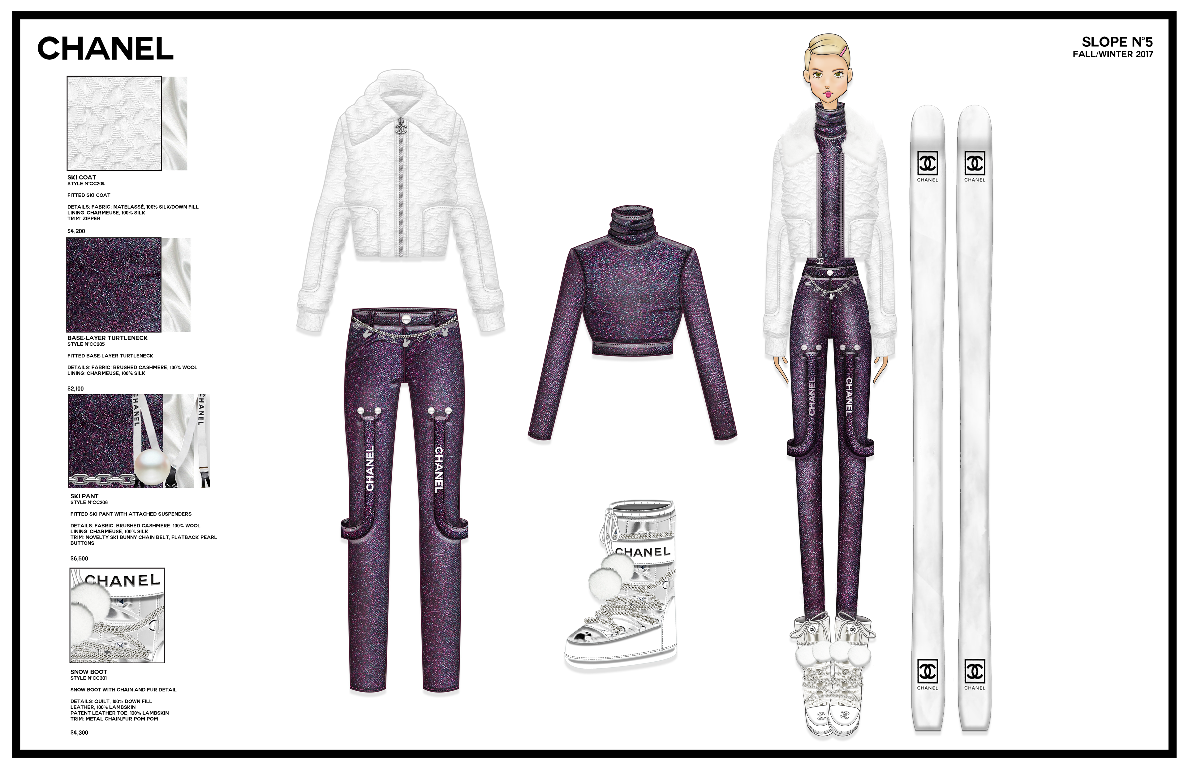 CHANEL Fall/Winter 2017 Ready-to-Wear collection inspired by the theme "Slope No. 5", incorporating authentic CHANEL fabric swatches, buttons, and trims. The collection was meticulously designed with a comprehensive inspiration board, color story, pricing strategy, and original designs, organized into cohesive merchandised looks that reflect the brand’s timeless elegance and modern sensibility. This collection was recognized by the Product Development Board and President of Los Angeles' Fashion Institute of Design & Merchandising (FIDM) and showcased for its innovative approach and design excellence.
