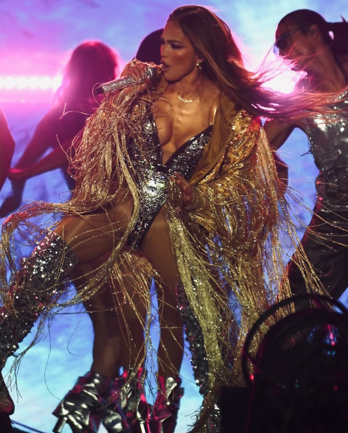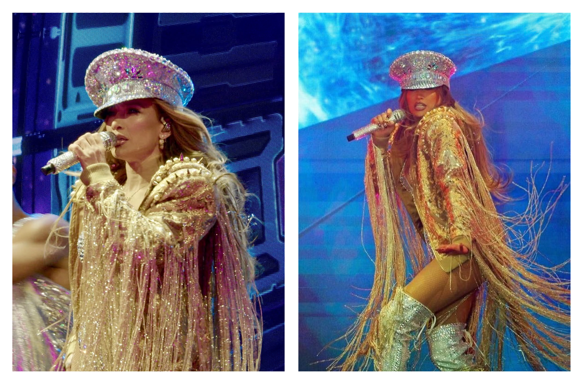 Custom-embellished catsuit for Jennifer Lopez’s high-profile performance on the Elvis All-Star Tribute, and gold fringe embellished jacket for her JLo Live in 2025 performance.